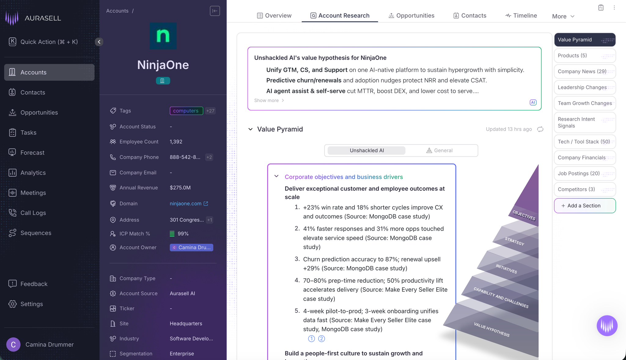 Let Aurasell agents research your accounts to your reps can create value pyramids and value hypothesis' in minutes. It shouldn't take hours to read and understand annual reports or public filing documents.